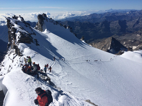 Der Aufstieg zum Gran Paradiso beginnt früh morgens ab dem Rifugio Vittorio Emanuele II 2732 m. Über gut markierte Wege und Firnfelder erreichen wir den Gletscher, wo wir angeseilt in gleichmässiger Steigung Richtung Gipfel aufsteigen. Kurz unterhalb des Gipfels wechseln wir in felsiges Gelände und erreichen über einen kurzen, ausgesetzten Grat die markante Madonna-Statue auf 4061 Metern. Der Gipfel belohnt mit einer beeindruckenden Rundsicht auf die höchsten Berge der Alpen. Der Abstieg erfolgt entlang der Aufstiegsroute zurück zur Hütte – eine klassische, abwechslungsreiche Hochtour in grossartiger Hochgebirgslandschaft. (Aufstieg ca. 4 - 5 Stunden und 1330 Höhenmeter, Abstieg zur Hütte ca. 3 - 4 Stunden und weiter ins Tal.)