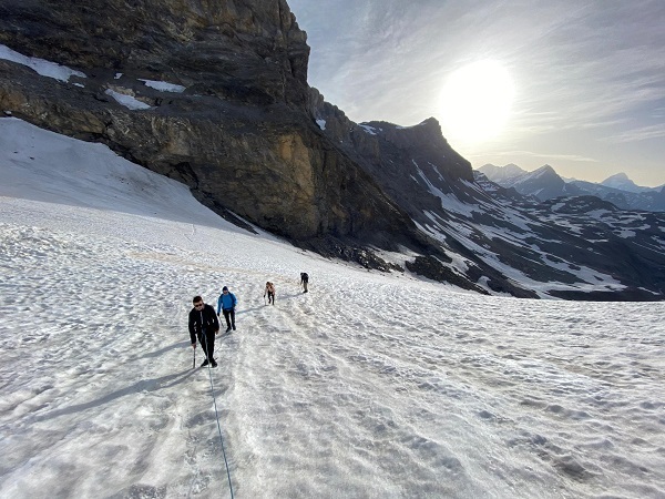 Nach dem Frühstück verlassen wir, noch bei Dunkelheit, die Hütte und wandern dem Oberen Grindelwaldgletscher entgegen. Über einfache Felspartien, Moränen und Felsstufen, gelangen wir auf den Rücken und steigen weiter über das Beesibärgli bis zum Gletscher hinauf. Diesen erreichen wir bei rund 2840 Metern Höhe. Wir folgen dem Oberen Grindelwaldgletscher, überwinden einige imposante Spalten und lassen die Rosenegg 3455m rechts liegen. Nun steigen wir über den Firnhang zum Vorgipfel 3644m auf. Ab hier gehts in leichter Kletterei über den Felsgrat auf den Gipfel (Skigipfel) des Rosenhorns 3689m, welchen wir nach rund 5 - 6 Stunden erreichen. Nach der verdienten Gipfelpause gehts zurück zum Vorgipfel. Über den Firnhang gehen wir nun gegen Westen und steigen durch die Wätterlimi auf den Gouwligletscher runter. Diesen steigen wir ab, bis wir den Wanderweg zur Gaulihütte 2204m erreichen. Diesem folgend gehts dann bis zur neu sanierten Hütte. Wenn wir Glück haben, sehen wir sogar noch Überreste der Dakota. Nun lassen wir den Tag bei Kuchen, Getränken und einem feinen Abendessen gemütlich ausklingen.