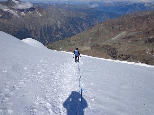Noch bei Dunkelheit verlassen wir die Hütte und steigen über den gut markierten Weg hoch zum Zwischenbergpass 3268m. Nun steigen wir dem Südgrat entlang über leichte Kletter- und Gehpassagen zum Vorgipfel. Von hier gehts über den Firngrat hoch auf den Gipfel des Weissmies 4017m. Wir geniessen den tollen Rundblick über all die 4000er Gipfel und steigen dann über den spaltenreichen und dadurch sehr imposanten Triftgletscher runter zum Berghaus Hohsaas. Hier werden wir die schöne Aussicht geniessen, den Nachmittag ausklingen lassen mit einem feinen Abendessen und frühzeitig zu Bett gehen, um dann fürs Lagginhorn am kommenden Tag ausgeschlafen zu sein.